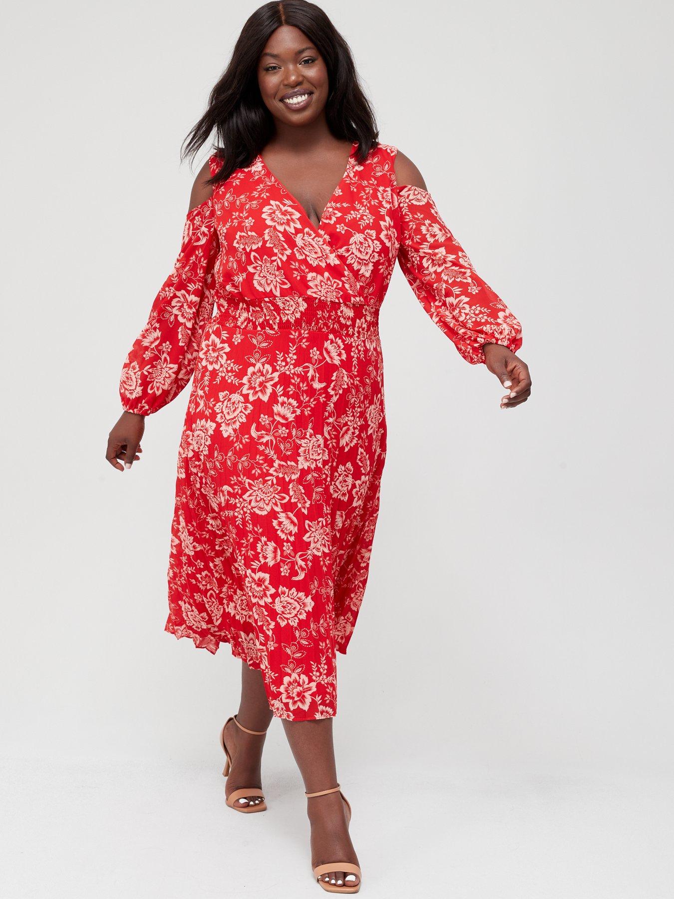 V By Very Curve Cold Shoulder Pleated Skirt Floral Midi Dress Red Very Co Uk